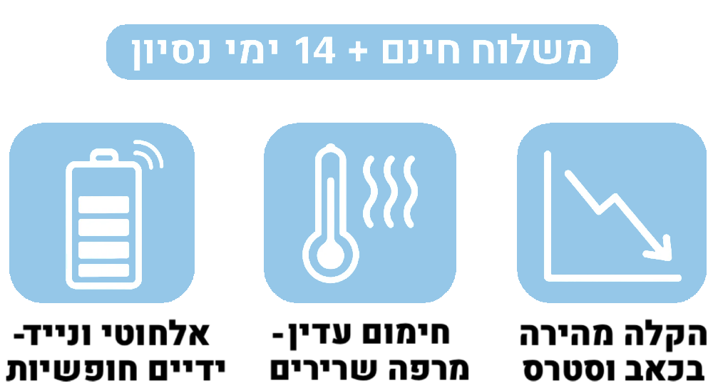 10-15 דקות עם המכשיר והחימום העדין בדיוק איפה שכואב, והתוצאה - פחות כאב ונוקשות, יותר תנועה, ריכוז ושינה קלה יותר. אלחוטי, שקט ונוח - בכל זמן ובכל מקום.
